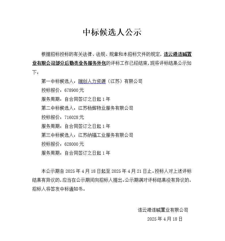 連云港連堿置業有限公司部分后勤類業務服務外包中標候選人公示