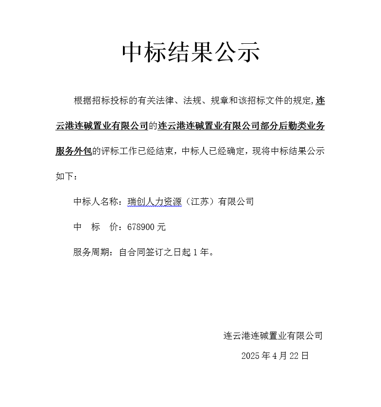 連云港連堿置業有限公司部分后勤類業務服務外包中標結果公示